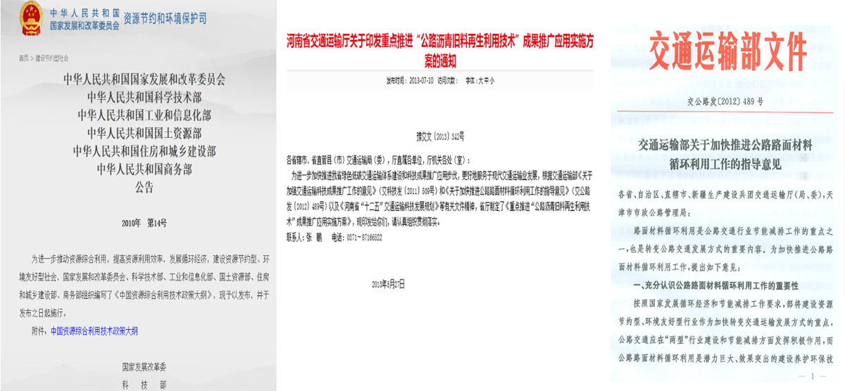 2013年,河南省交通运输厅关于印发重点推进“公路沥青旧料再生利用技术”成果推广应用实施方案的通知,豫交文【2013】 342号,进一步要求重复利用资源的“可持续发展”战略。