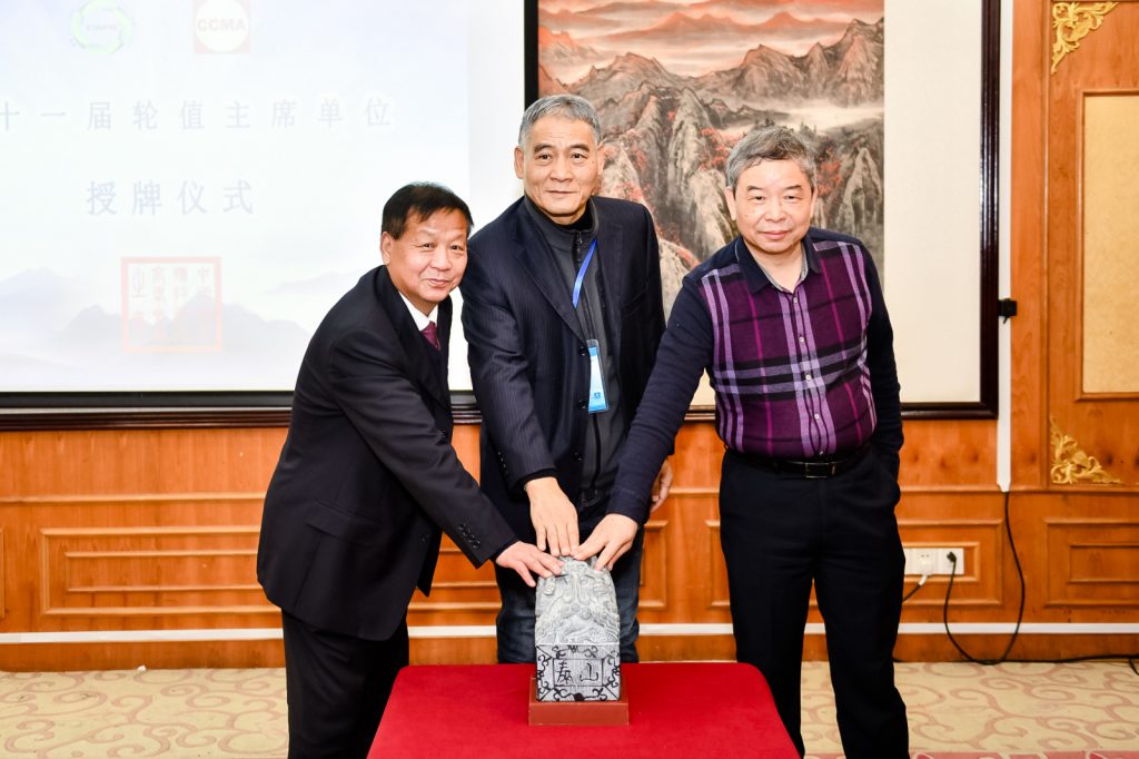 在中国工程机械工业协会筑养路机械分会会长焦生杰(中)的见证下,福建省铁拓机械股份有限公司董事长王希仁(右)向本届高峰会议轮值主席单位南阳市亚龙筑路机械制造有限公司名誉董事长王志兴(左)移交峰会印信“泰山玺”