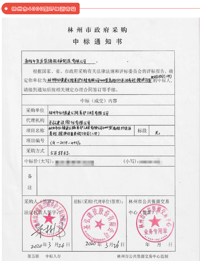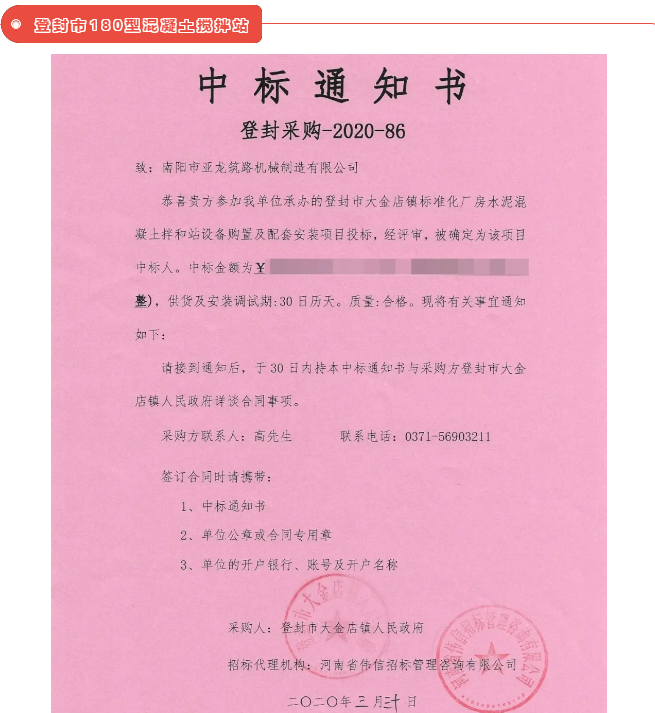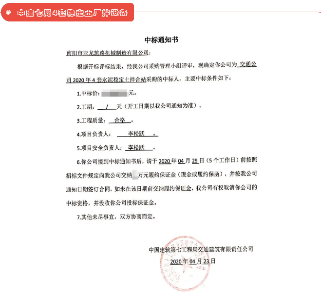 3月26日中标“林州市红旗渠公路养护工程有限公司4000型高档环保沥青砼搅拌设备采购项目”,3月30日中标“登封市大金店镇标准化厂房水泥混凝土拌合站设备购置及配套安装项目”,4月23日中标“中建七局交通公司2020年4套水泥稳定土拌合站采购项目”。